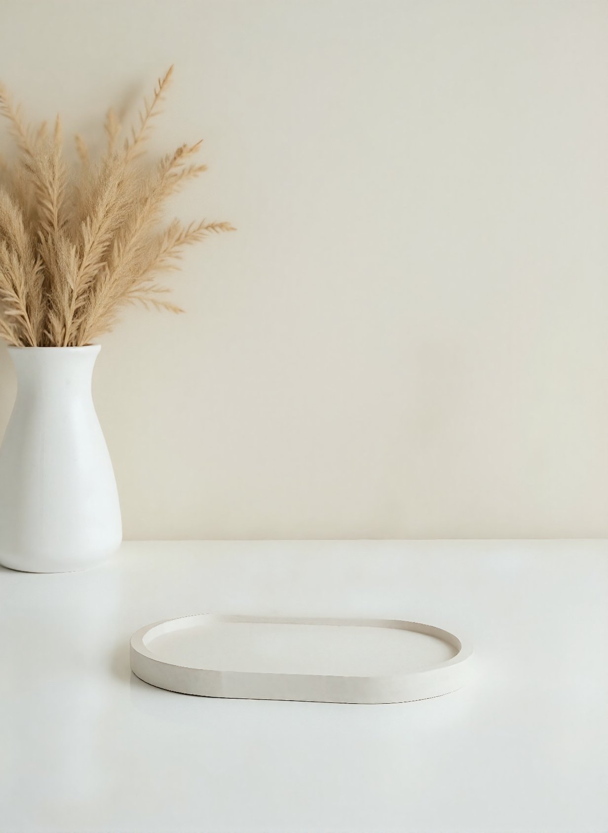 Elegantiškas rankų darbo padėkliukas pagamintas iš baltojo cemento ir marmuro mišinio, suteikiančio jam modernią tekstūrą. Neutralus atspalvis ir išgryninta ovali forma puikiai dera bet kuriame interjere – nuo modernaus iki skandinaviško.
