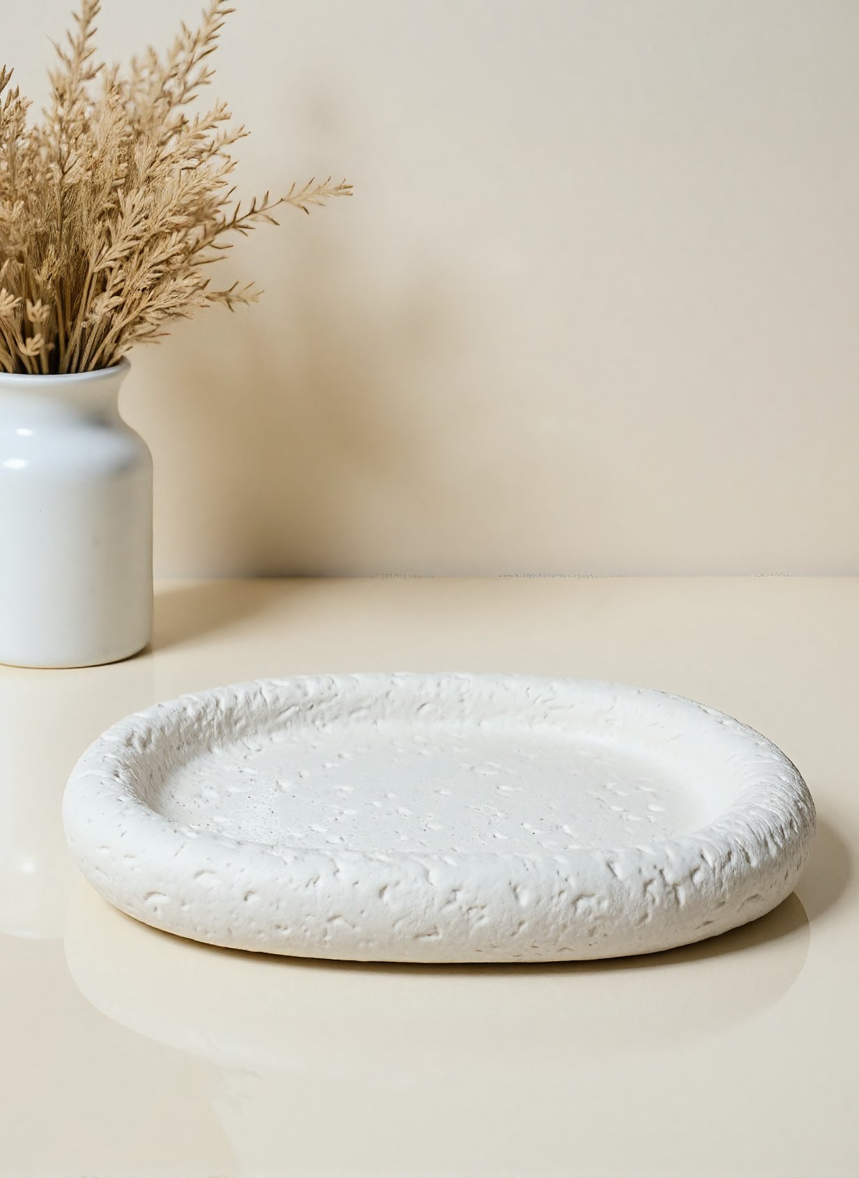 Elegantiškas rankų darbo padėkliukas pagamintas iš baltojo cemento ir marmuro mišinio, suteikiančio jam modernią tekstūrą. Neutralus atspalvis, išgryninta akmens imitacijos ovali forma puikiai dera bet kuriame interjere – nuo modernaus iki skandinaviško.